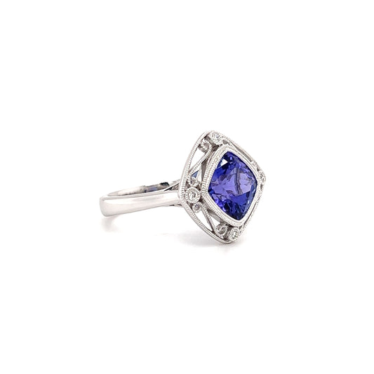 Cushion Tanzanite Ring with Four Side Diamonds in 14K White Gold