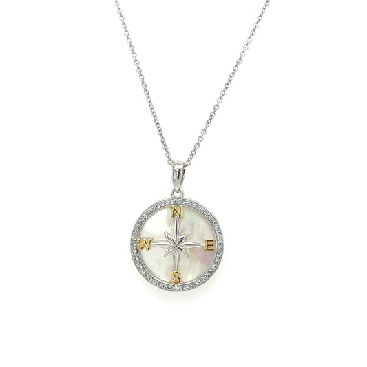 Mother of Pearl Compass Necklace with White Crystals in Sterling Silver