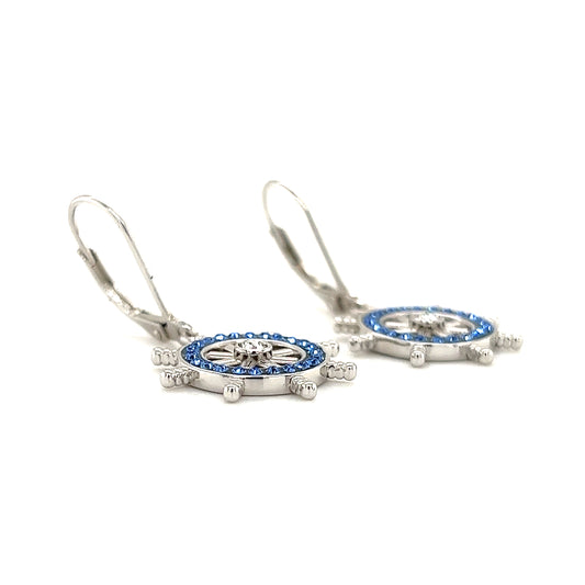 Ship's Wheel Dangle Earrings with Blue and White Crystals in Sterling Silver