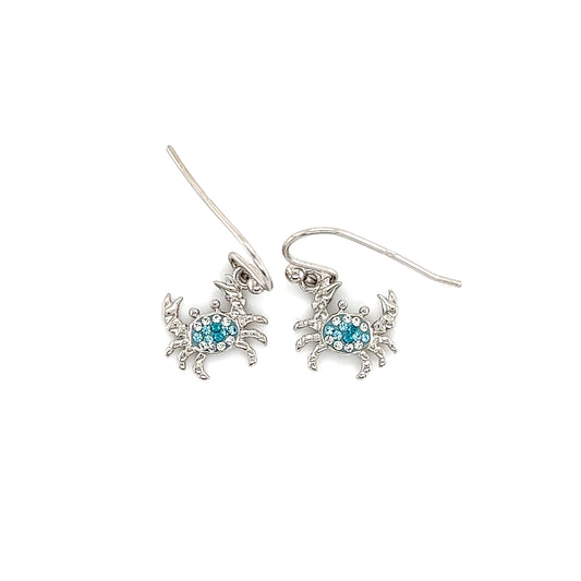 Blue Crab Dangle Earrings with Aqua and White Crystals in Sterling Silver