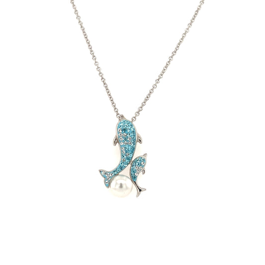 Blue Dolphins Necklace with White Pearl and Crystals in Sterling Silver