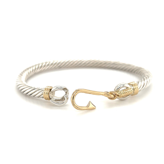 Fish Hook Cable 5mm Bangle Bracelet with 14K Wraps and Clasp in Sterling Silver