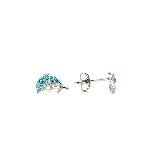 Dolphin Stud Earrings with Aqua and White Crystals in Sterling Silver
