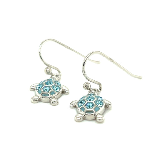 Sea Turtle Dangle Earrings with Aqua Crystals in Sterling Silver