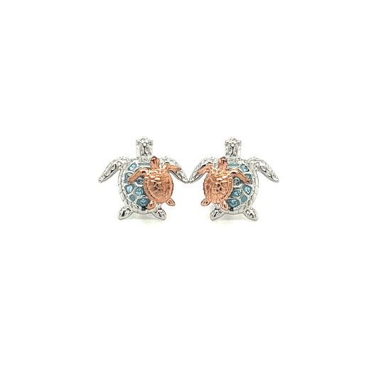 Sea Turtle Stud Earrings with Rose Gold Accents and Aqua Crystals in Sterling Silver