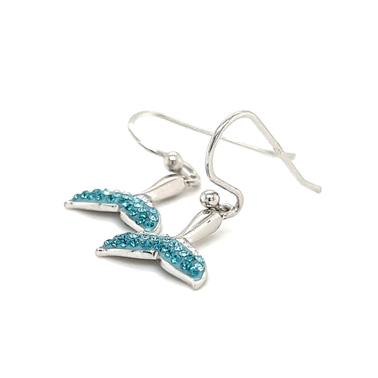 Whale Tail Dangle Earrings with Aqua Crystals in Sterling Silver