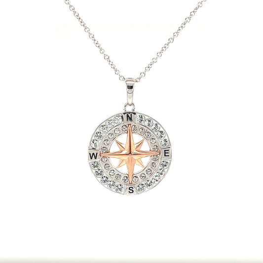 Compass Necklace with Rose Plated Rose and White Crystals in Sterling Silver