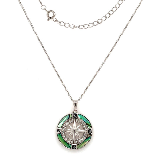 Abalone Shell Compass Necklace with White Crystals in Sterling Silver