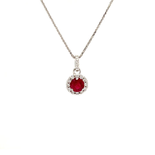 Round Ruby Pendant with Diamond Halo in 14K White Gold