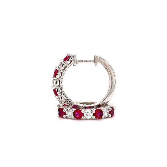 Ruby Hoop Earrings with Six Round Diamonds in 14K White Gold