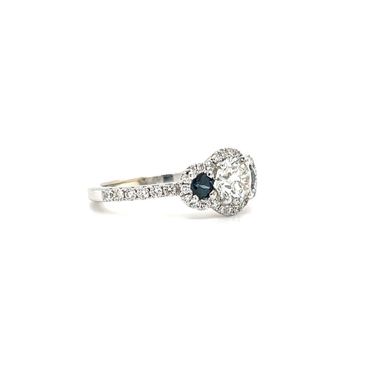 Round Diamond Ring with Two Side Sapphires and Diamond Halo in 14K White Gold