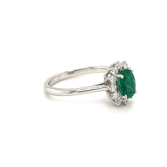 Oval Emerald Ring with Floral Diamond Halo in 18K White Gold