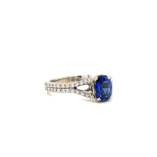 Oval Blue Sapphire Ring with Split Diamond Shank in 14K White Gold