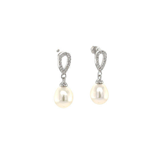 Rice Pearl Dangle Earrings with White Crystals in Sterling Silver
