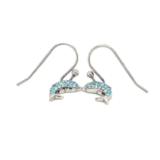 Dolphin Dangle Earrings with Aqua and White Crystals in Sterling Silver