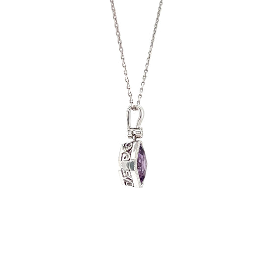 Asscher Amethyst Pendant with One Diamond in 14K White Gold
