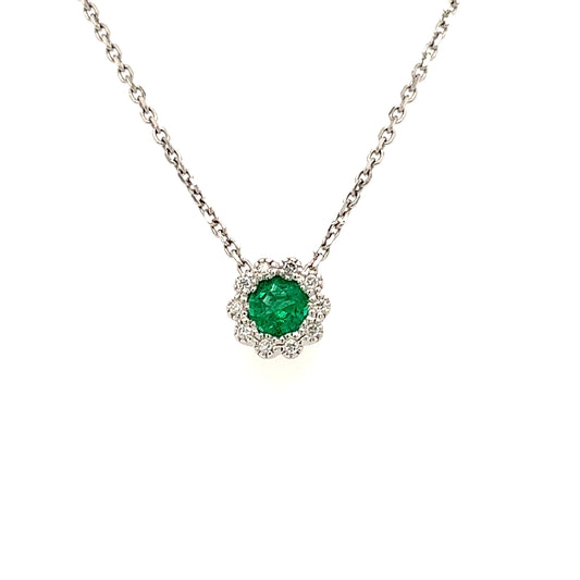 Floral Emerald Pendant with Diamond Halo in 14K White Gold