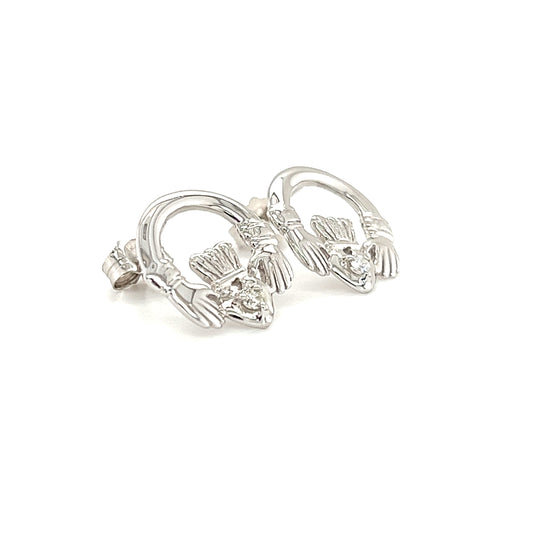 Claddagh Stud Earrings with Round Diamonds in 14K White Gold