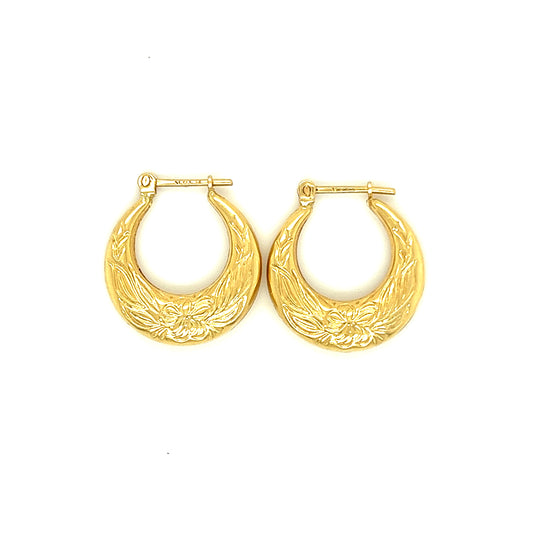 Hoop 18mm Earrings with Flower Engraving in 14K Yellow Gold