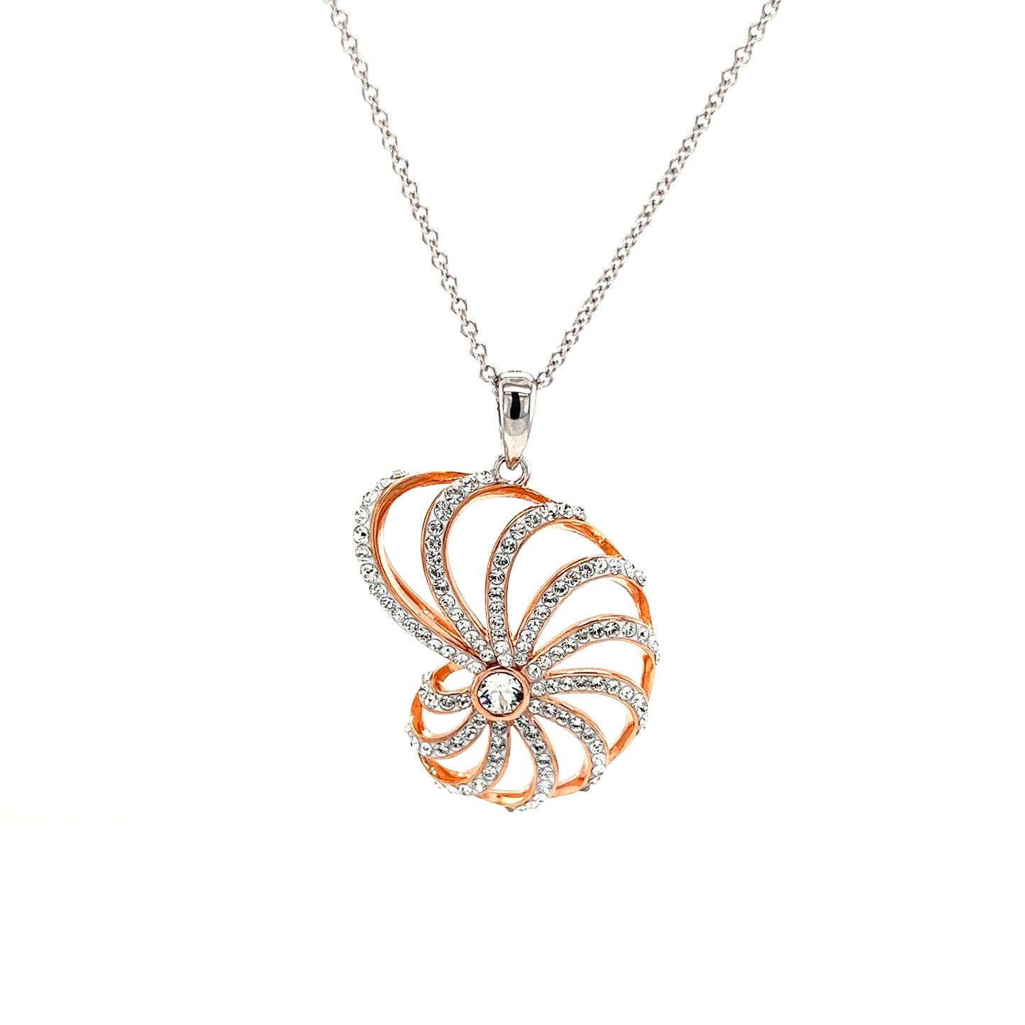 Slide smoothly from day to night events with this simple and yet sophisticated nautilus necklace. Beautifully crafted in polished sterling silver, this necklace features a In the center of the pendant there is a big white Swarovski crystal, and from it there is a total of eleven septums. Each septum has been stunningly decorated with white Swarovski crystals. To add color and contrasts a rose gold plating has been applied to this pendant. This necklace is completed by a strong adjustable cable chain, that allows you to wear this necklace at any length from 18 inch to 20 inches.