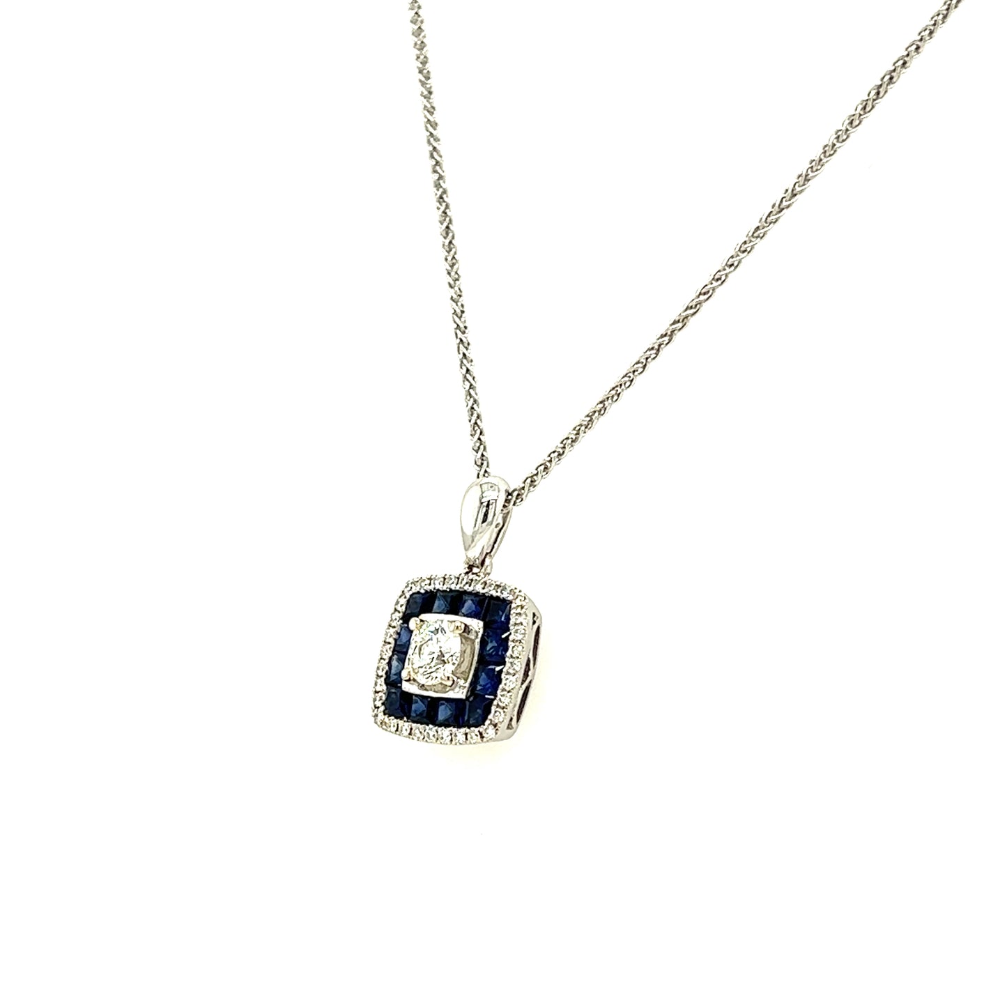 This striking necklace combinds a beautiful pendant and chain. The pendant has been carefully crafted in polished 14K white gold and features a 0.15ct round diamond at its center. A frame of 12 Ceylon sapphires come together to highlight the centerpiece with their contrasting rich blue color. The outer border has been embellished with 38 round diamonds for a total carat weight of 0.38ctw. A 10K white gold 1mm wheat chain completes this necklace, displaying the stunning pendant at 16 inches of length.