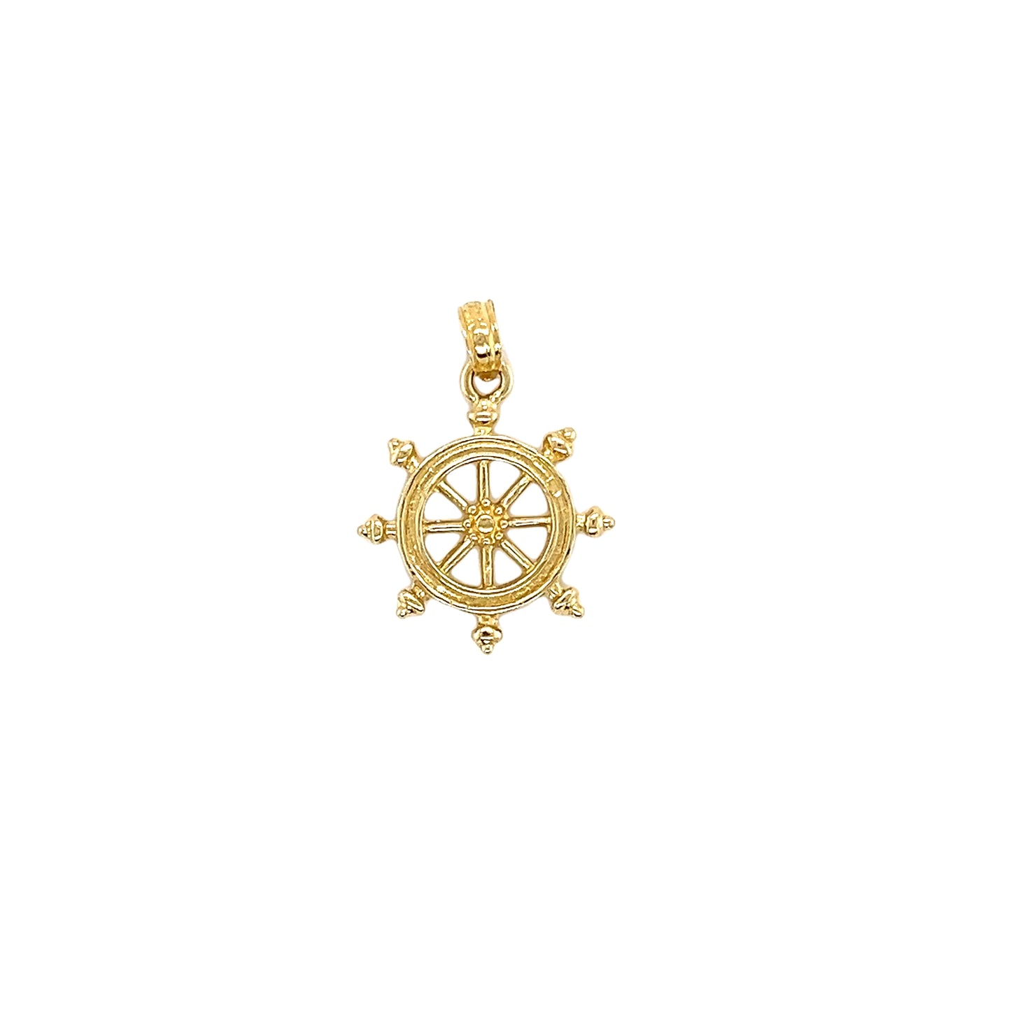 This ship wheel pendant has been crafted in 14K yellow gold and features intricate details that will enhance any necklace or bracelet. Inspired by maritime culture, this pendant can be used as a charm and it will be an elegant addition to any charm collection.