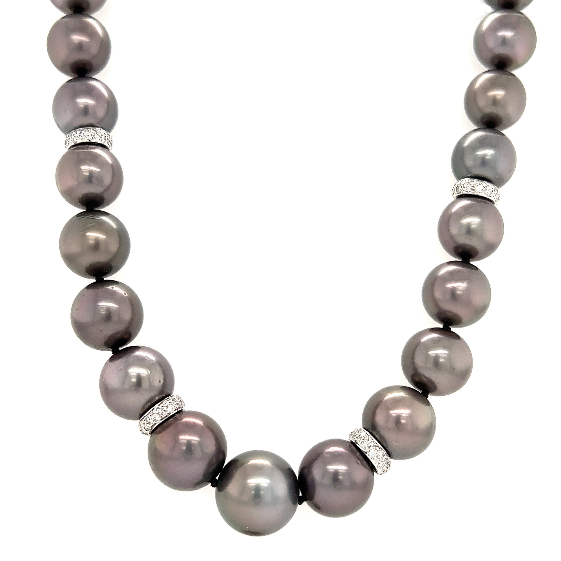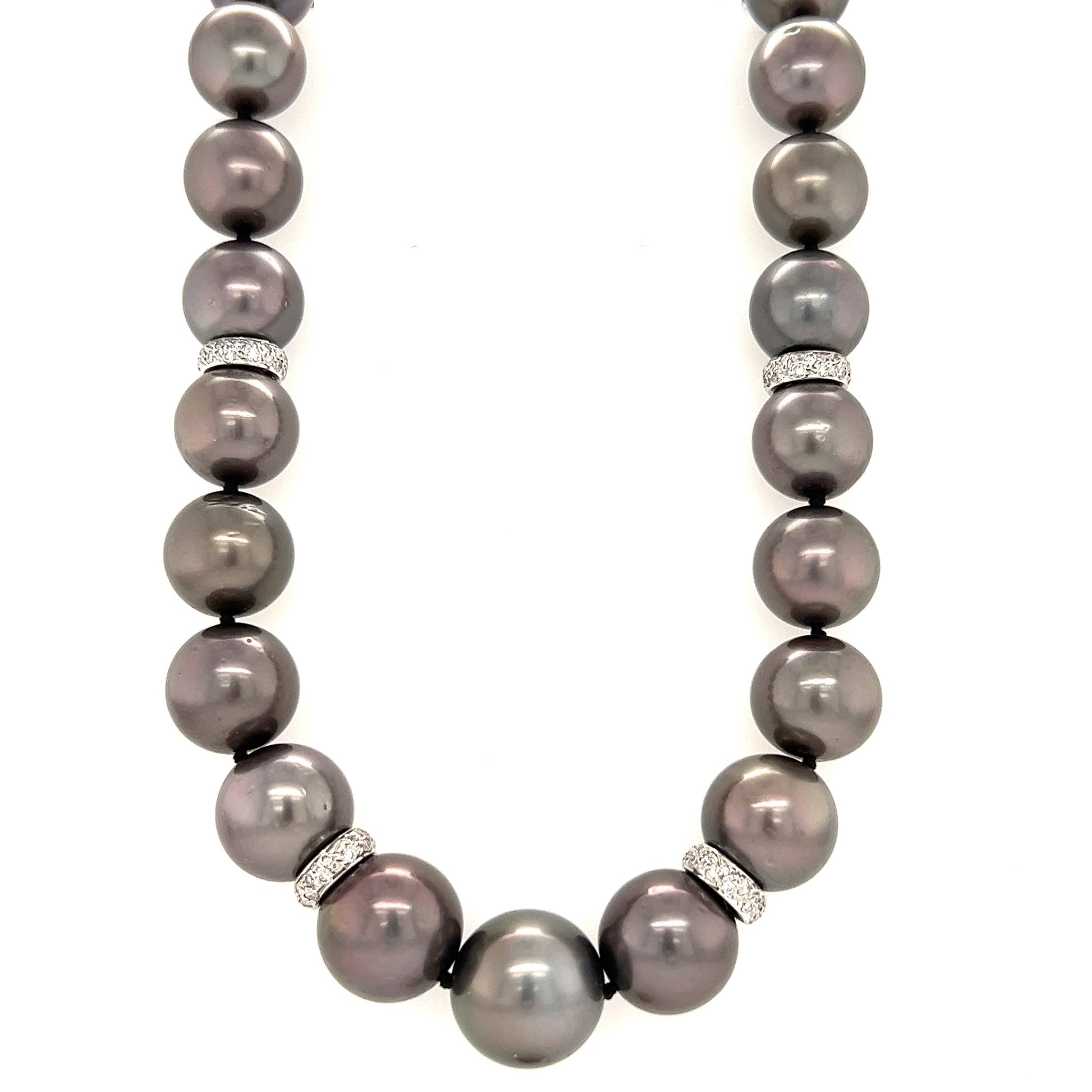 This top quality Tahitian black pearl necklace will take your breath away. A total of 35 Tahitian black pearls are strung with black silk thread containing a knot in between each pearl for safety against breaks. The pearls are arranged, increasing progressively in size, allowing the 15mm pearl to be displayed in the center of the necklace. To add brilliance to this piece there are 4 rondelles and a security clasp that have been crafted in polished 14K white gold and decorated with over 100 round-cut diamonds. Add elegance to any night out with this stunning Tahitian black pearl necklace.