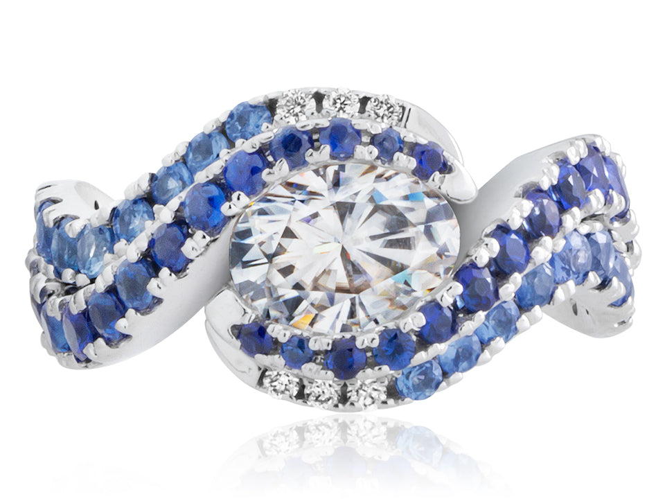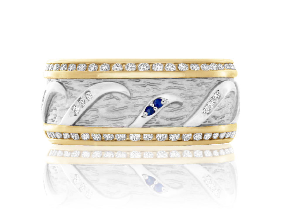 Diamond and sapphire "Wave" engagement ring and matching wedding band by Ron George.