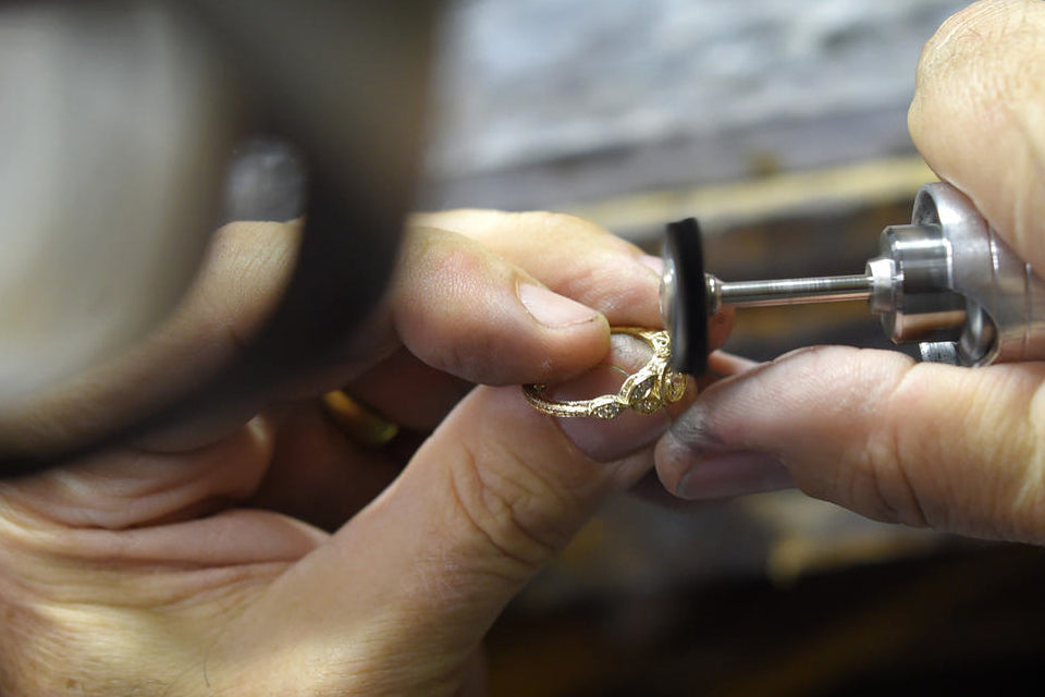 Custom designed engagement ring being polished at the bench.